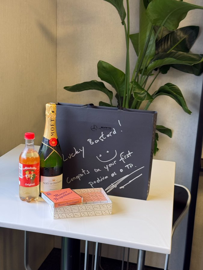 Quien reveló esto fue la misma cuenta de Mercedes, que mediante una publicación en “X” detallaron: “Toto y el equipo le dieron un regalo a James Vowles y su equipo por su primer podio como TP”. En la imagen se puede ver una botella de Champagne, además de otros productos dentro de la bolsa.